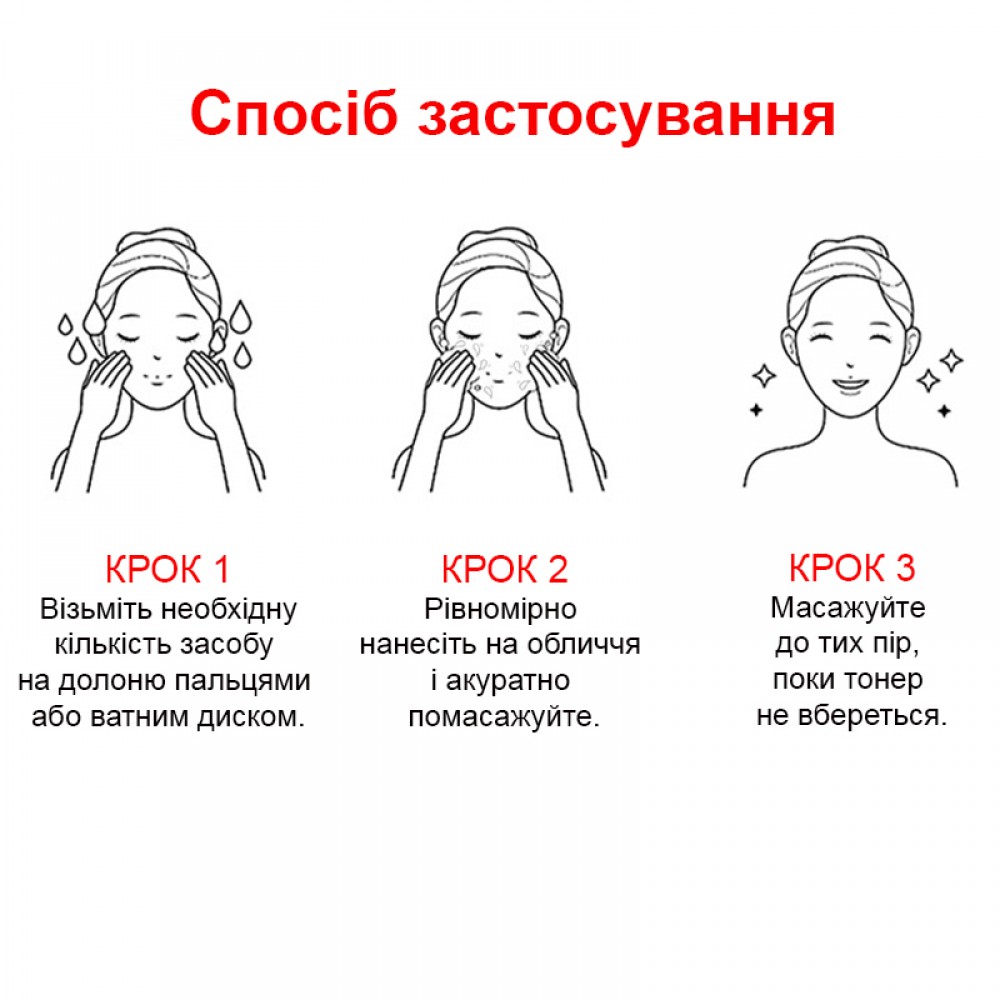 Спосіб застосування: нанесіть невелику кількість засобу на долоню, пальцями або за допомогою ватного диска. Розподіліть по очищеній шкірі обличчя і виконайте легкий масаж. Продовжуйте до повного вбирання тонера.