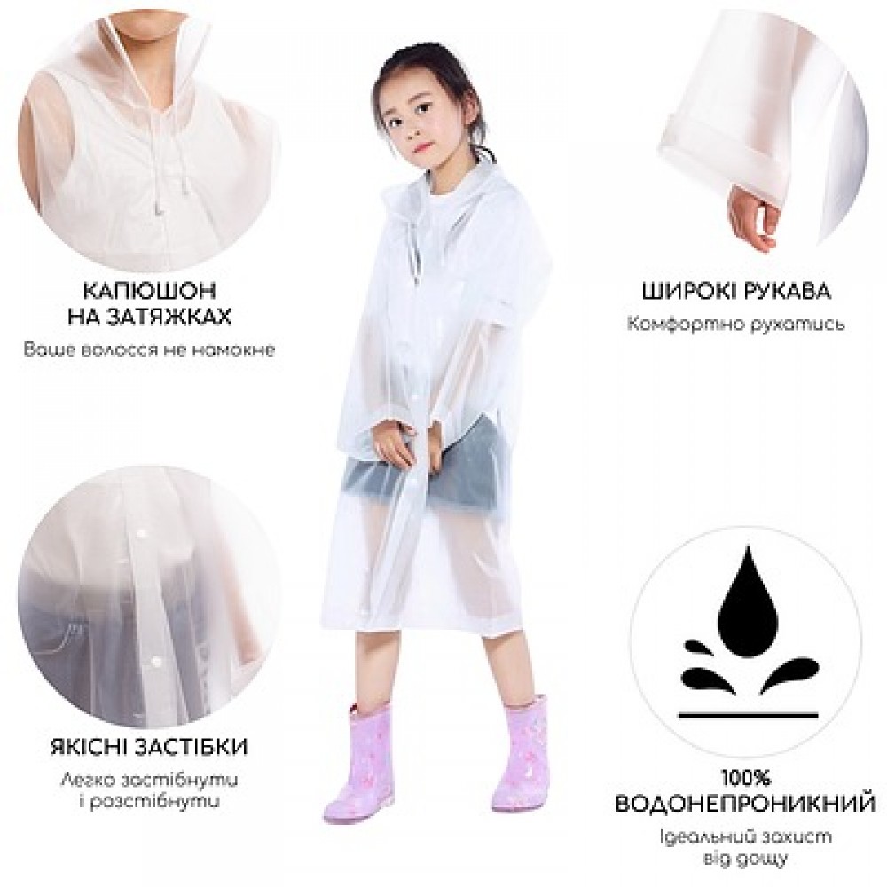 Дитячий дощовик з легкого і безпечного матеріалу EVA захищає від дощу і вітру, залишаючись зручним і практичним. Завдяки кнопковій застібці він легко одягається і знімається, а капюшон забезпечує додатковий захист. Плащ не сковує рухів і підходить для прогулянок, поїздок і активного відпочинку на свіжому повітрі. Компактний і легкий, він без зусиль поміщається в рюкзак або сумку.