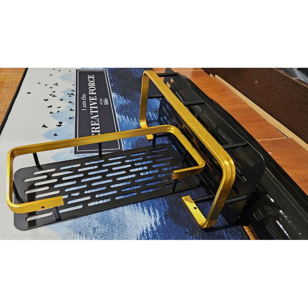 Полиця компактна, але містка: підходить для зберігання гелів, шампунів, мила та інших аксесуарів. Чорне з золотим покриттям додає сучасного акценту інтер’єру.