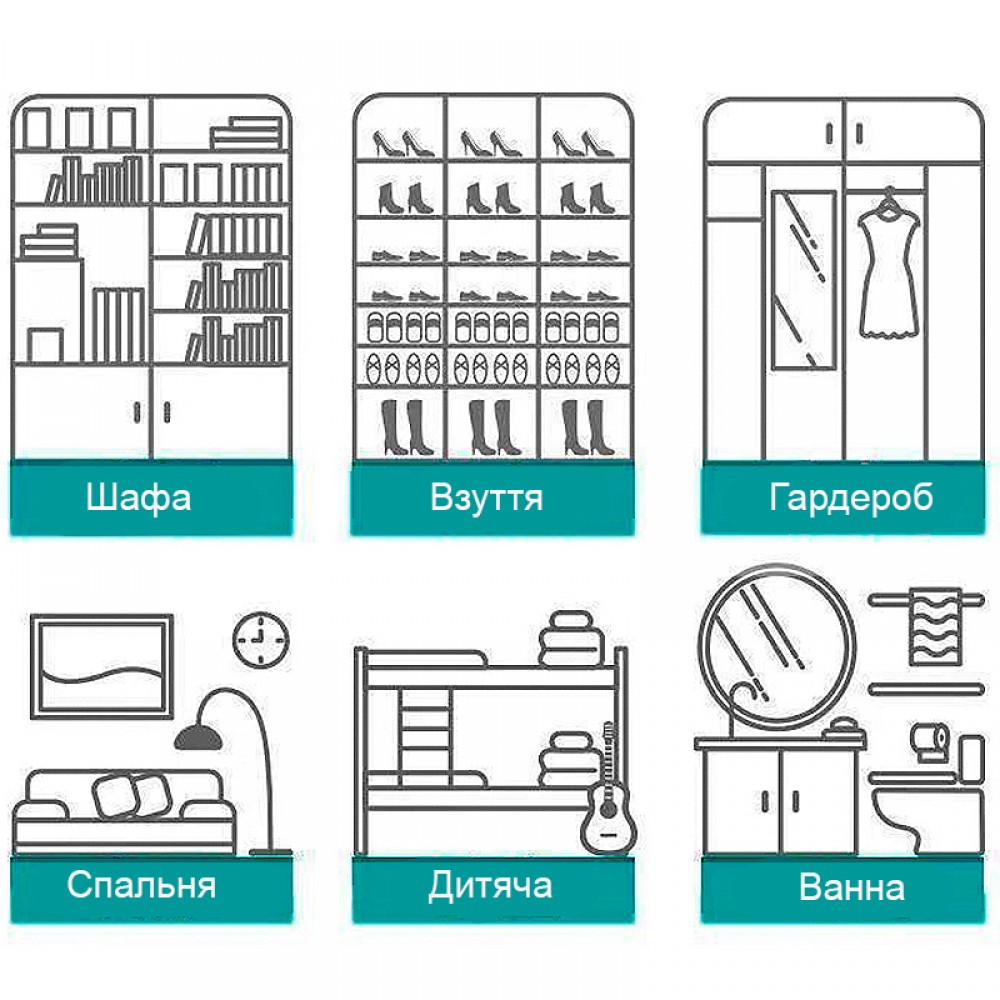 Область застосування: шафа, ванна, кухня, комора, взуттєві коробки
