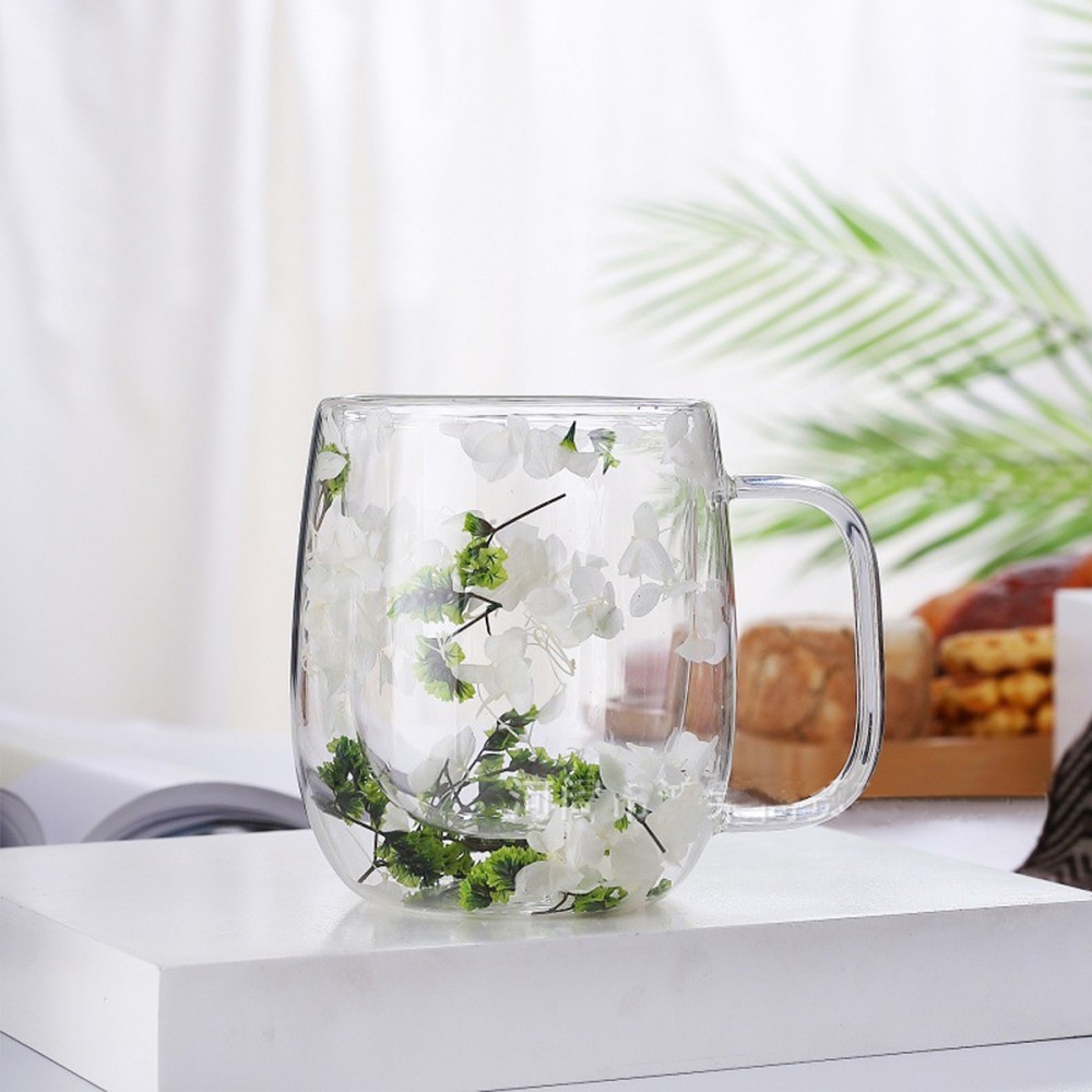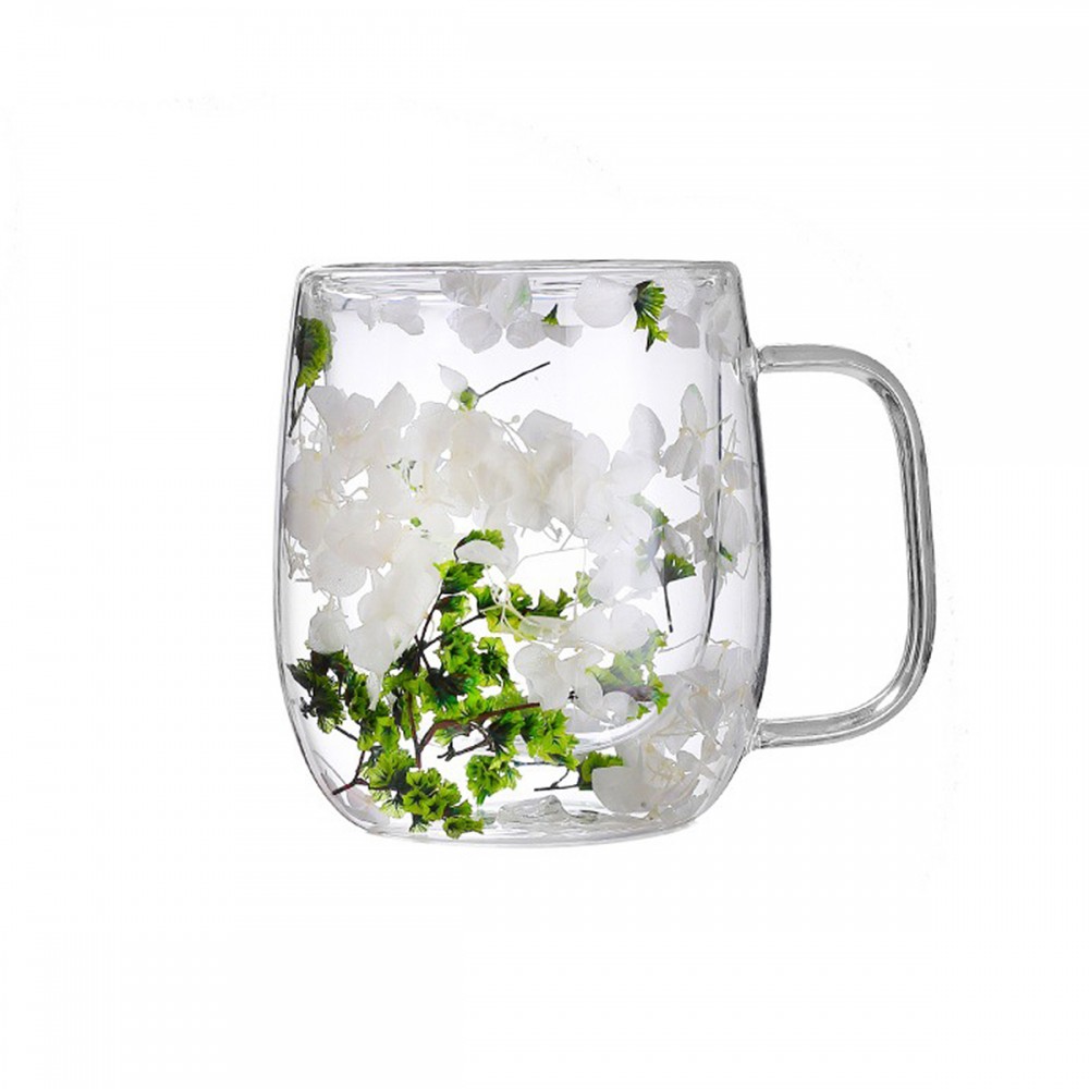 Скляні чашки з подвійними стінками і дном, прикрашені сухоцвітами - це елегантний і функціональний предмет, що ідеально підходить для любителів гарячих напоїв. Подвійні стінки забезпечують відмінну теплоізоляцію, що дає змогу зберігати температуру кави довше, не обпікаючи руки.