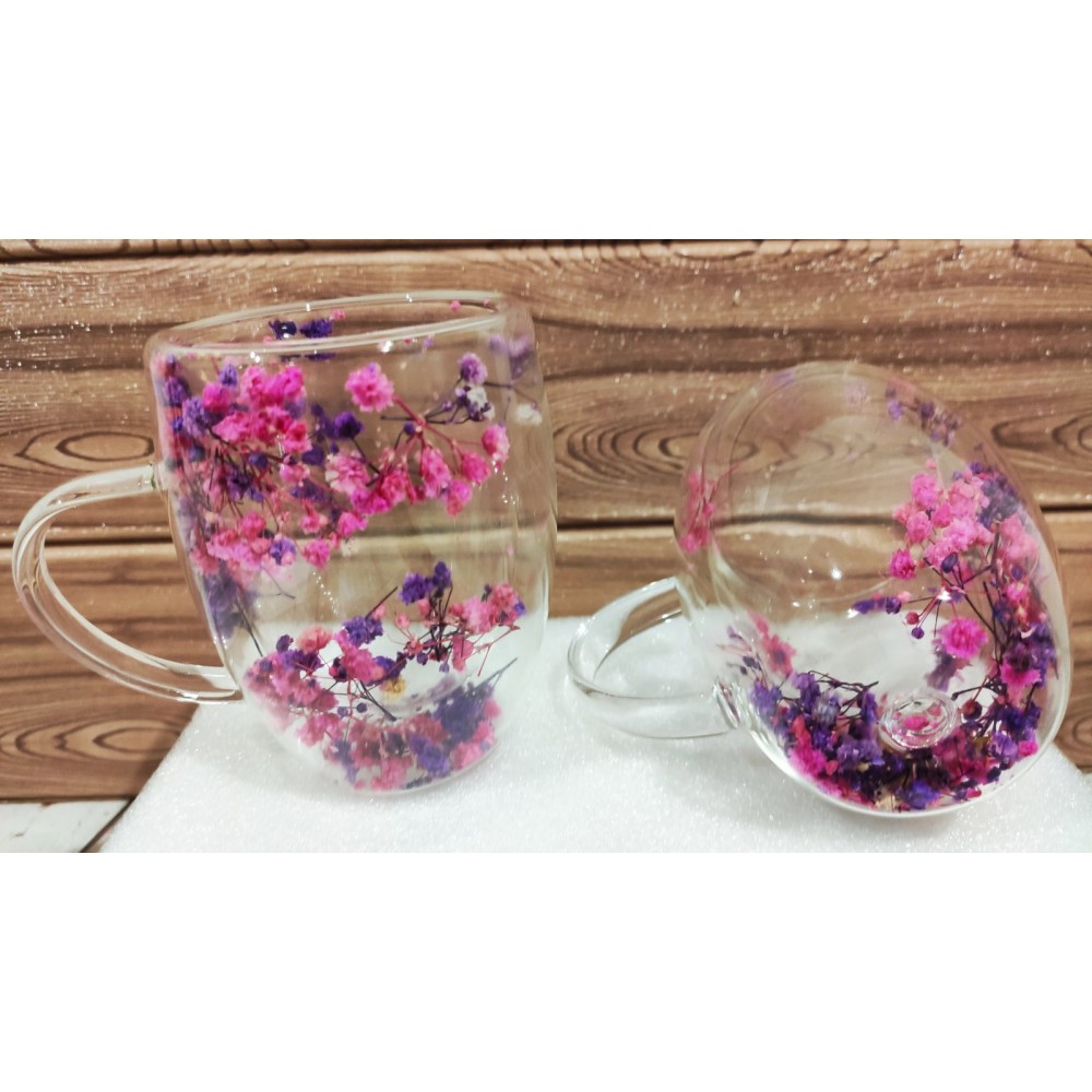 Скляні чашки з подвійними стінками і дном, прикрашені сухоцвітами - це елегантний і функціональний предмет, що ідеально підходить для любителів гарячих напоїв. Подвійні стінки забезпечують відмінну теплоізоляцію, що дає змогу зберігати температуру кави довше, не обпікаючи руки.