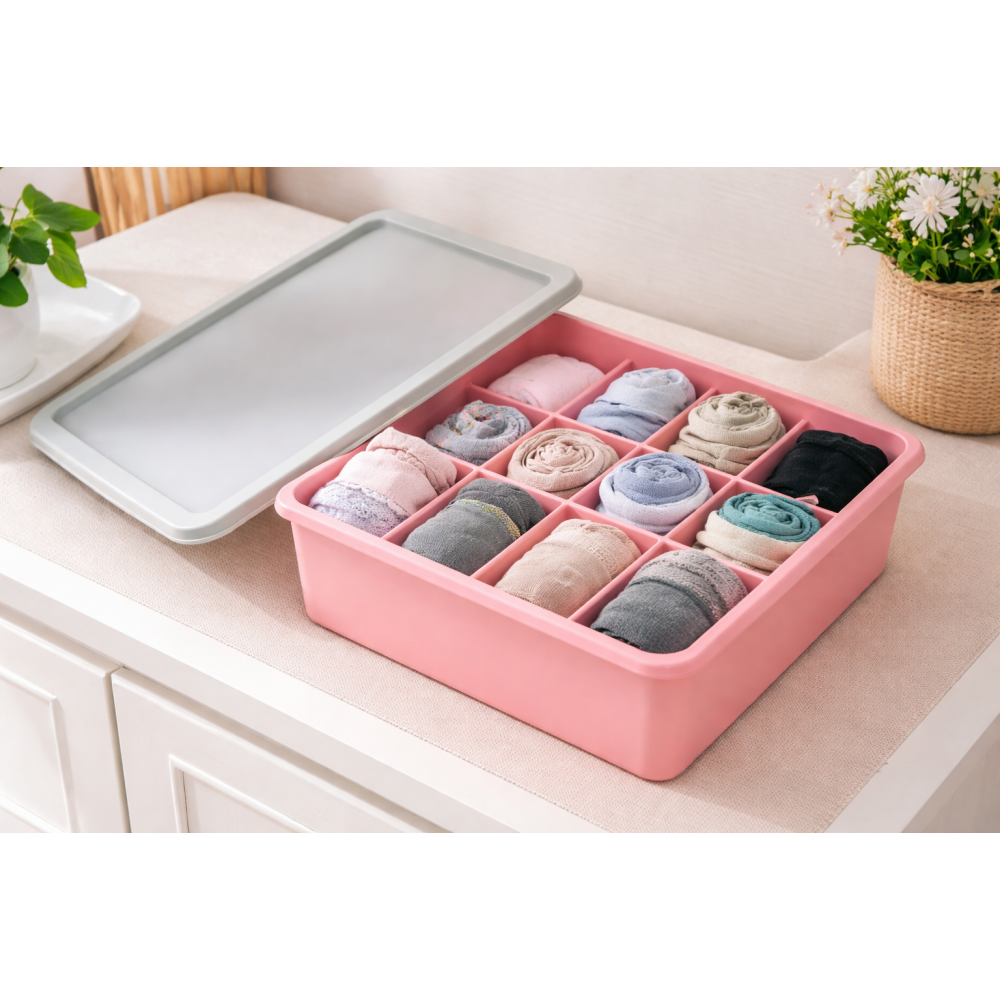 Оформить заказЯщик-органайзер с крышкой на 10 ячеек для хранения носков. Микс