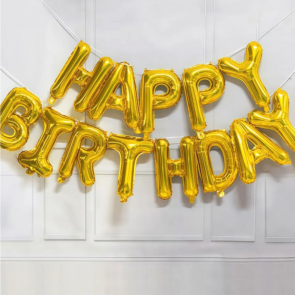 Оформить заказНабор надувных фольгированных шариков для создания композиции Happy Birthday. Золото