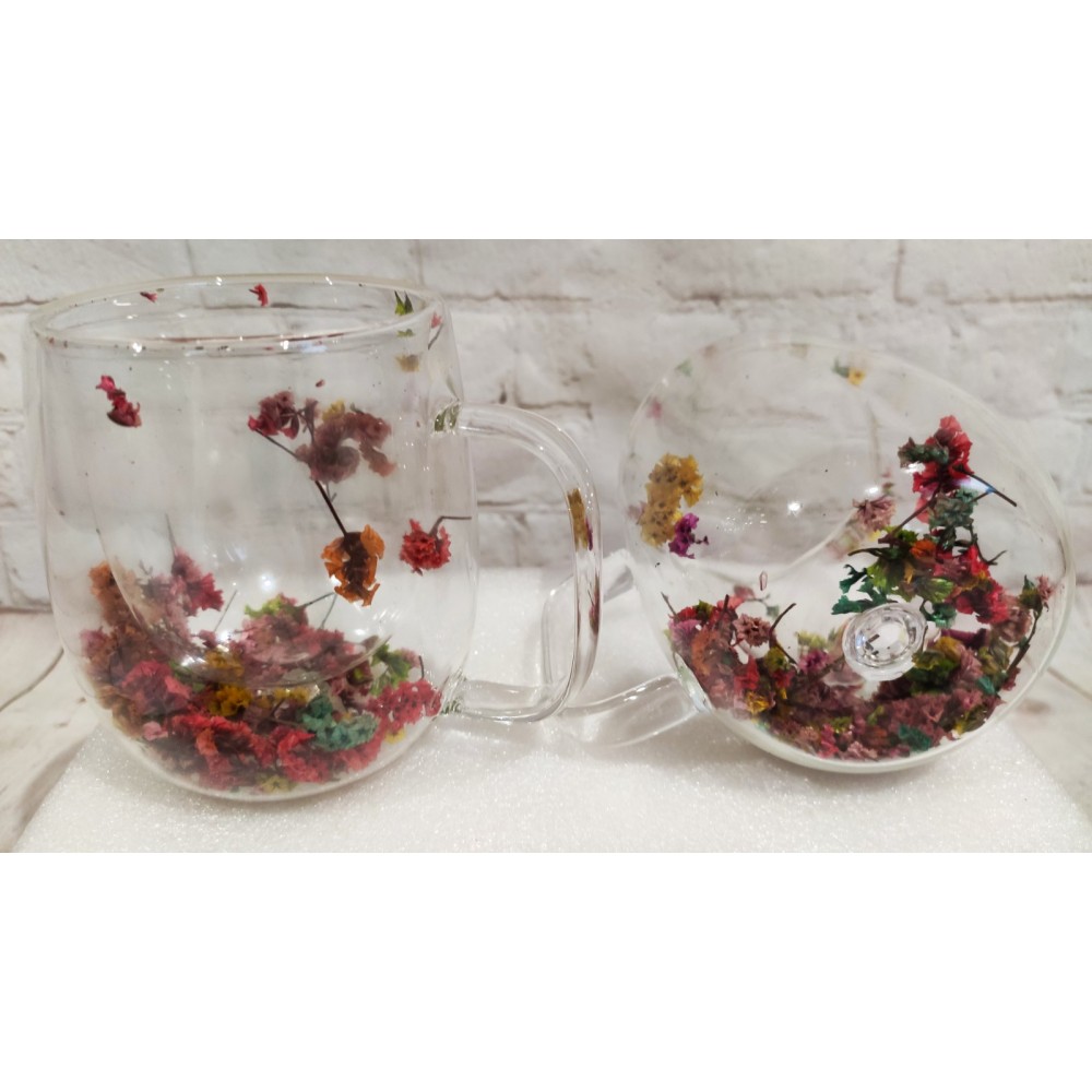 Оформить заказНабор стеклянных чашек с двойными стенками и дном, украшены сухоцветами разноцветными , 350 мл