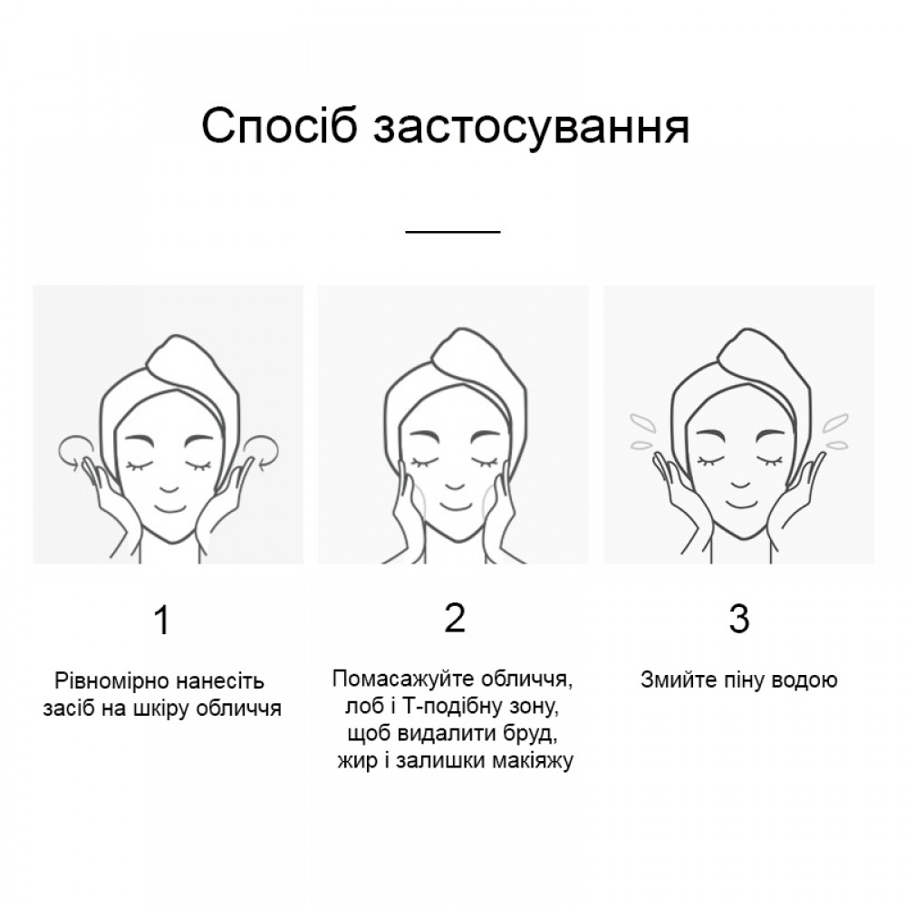 Способ применения: выдавите небольшое количество средства на ладонь, добавьте немного воды и вспеньте. Нанесите пену на лицо и начинайте очищение. Лёгкими круговыми движениями кончиков пальцев аккуратно массируйте кожу, смойте водой.