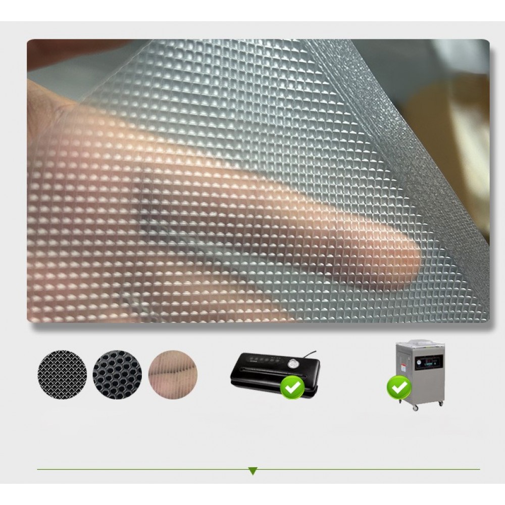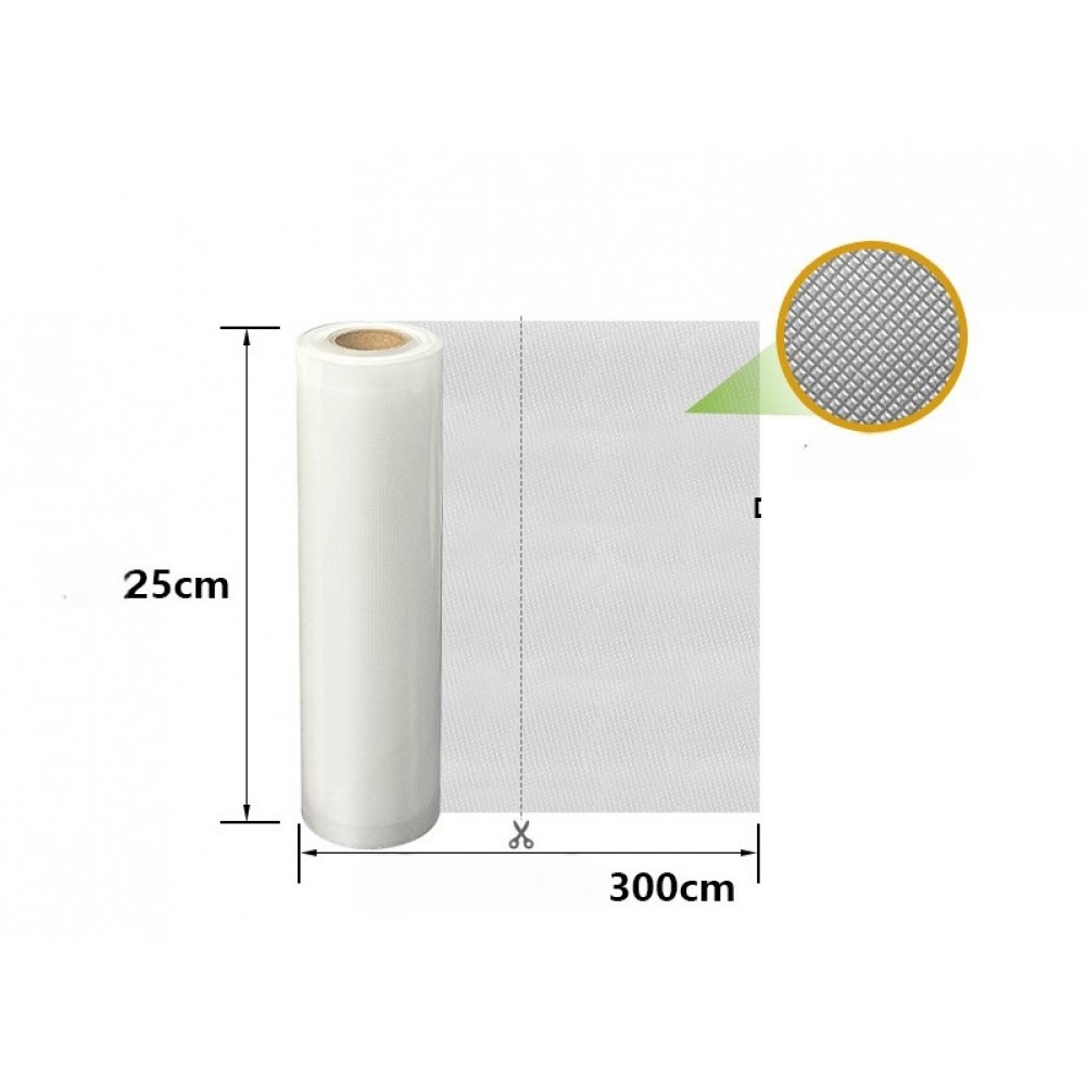 Рулон гофрированных пакетов для вакуумных упаковок, совместимых со всеми моделями бытовых вакууматоров. Рулон имеет размер 25 x 300 см и изготовлен из высококачественного материала PAPE (многослойного), известного своей прочностью, эффективной герметичностью и безопасностью для пищевых продуктов.
